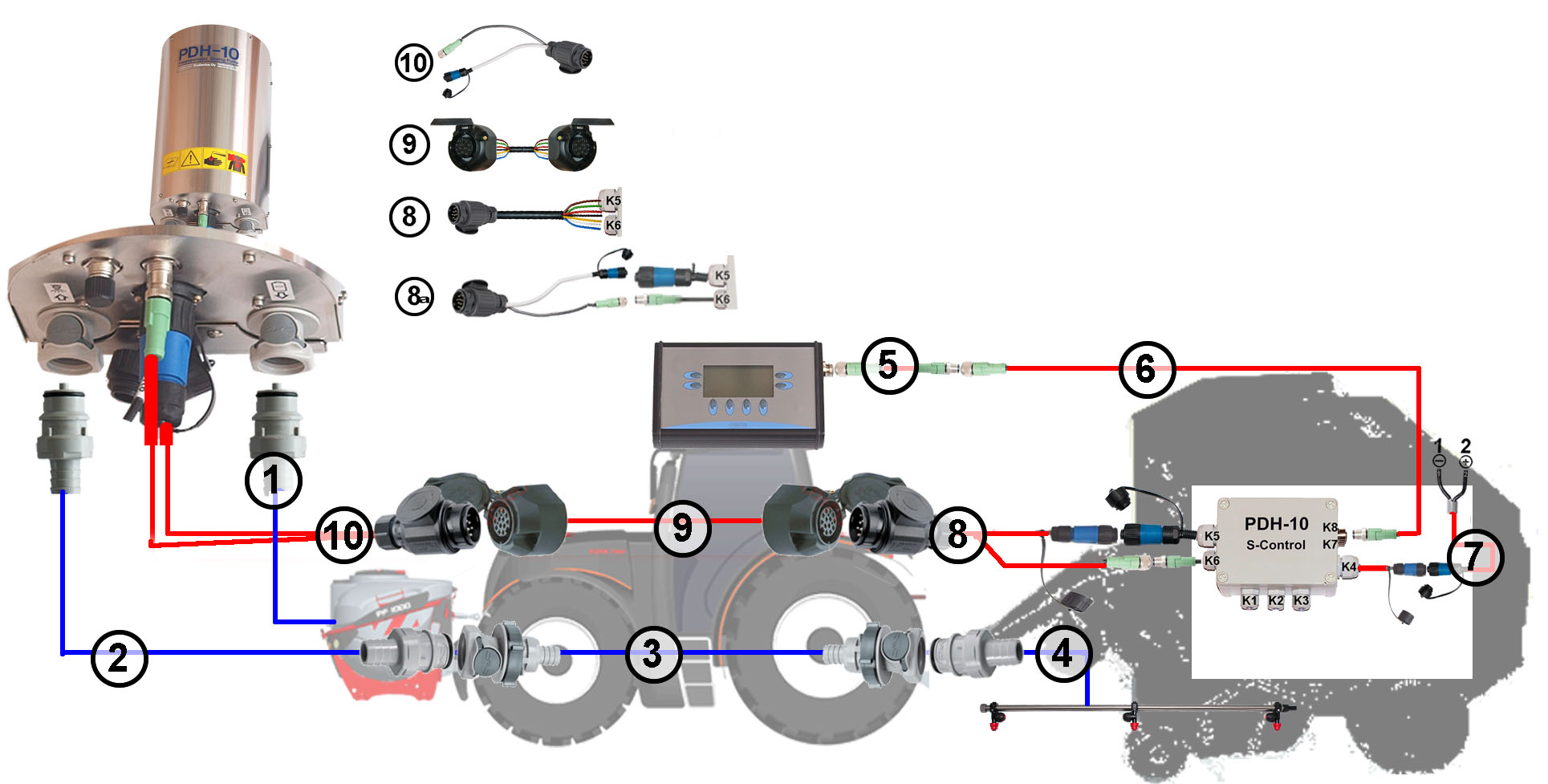 Pos. Nummern 8,9,10: Kabelstrang für Strom- und Steuerkabel mit robustem 13-Pol Stecker.